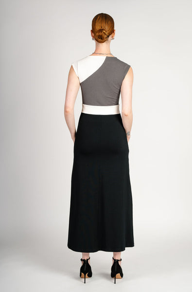 Color block maxi dress with a fitted sleeveless bodice that  features a V -neckline, color blocking in grey and white, fitted waistband and a full length black skirt with a gradual flare at bottom. Black, Gray, and Ivory.