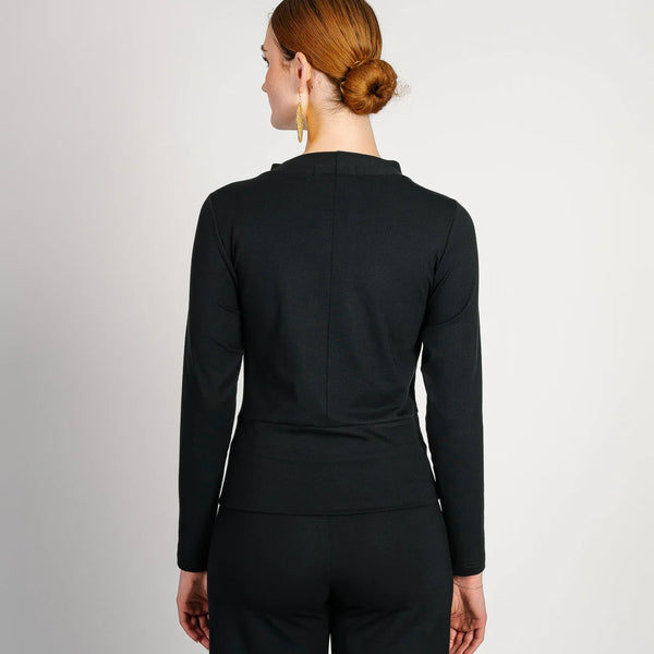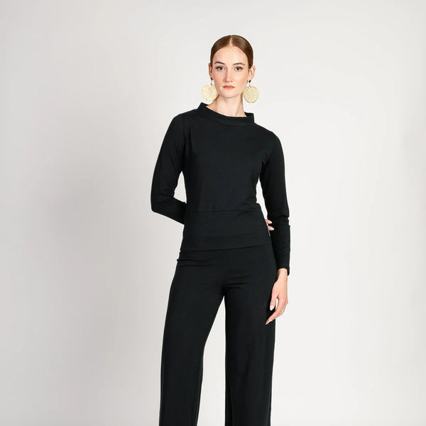 Black long sleeve blouse with a unique wide open stand up collar and a reinforced wide waistband for extra cinching. This design is made with organic cotton and spandex heavy weight jersey that gives it nice structure and the look of quiet luxury. It is a great closet staple as it is simple and elegant and can be worn with skirts, trousers, under suit jackets or simply with jeans. Works great as a layering piece  or as a simple clean canvas to display your statement Carla Shaw jewelry. A great piece for traveling as it is easy to care for and has minimal wrinkling. Made of organic cotton fabric that is certified to be sustainably grown and free of toxic dyes and finishes. Made in small batches in Massachusetts this is fashion that is ethical and sustainable but also elegant and timeless.