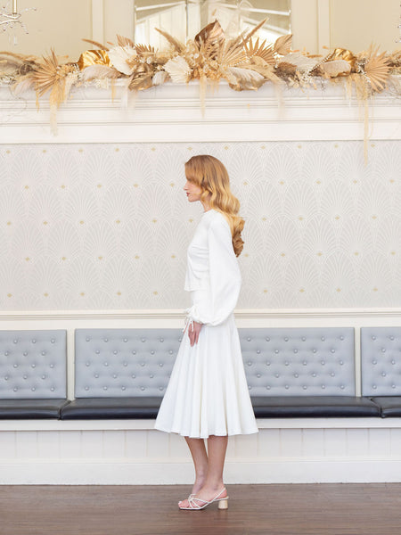 This tulip shaped midi skirt is made with 12 panels and a wide high waist band. It has beautiful flow and movement and feels super soft and comfortable. Part of our Femme Fatale collection, it is a great piece for all seasons and many occasions. Pair it with our Sydney top for a full monochromatic look. Made with our super soft buttery bamboo and organic cotton stretch french terry and available in ivory and black.
